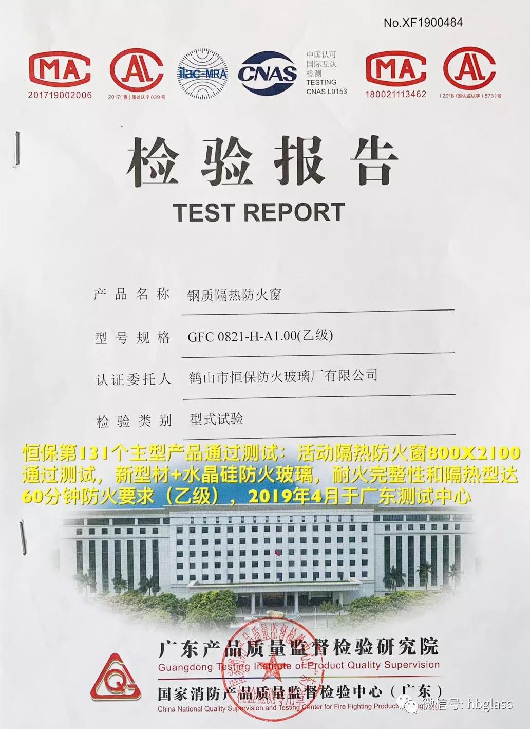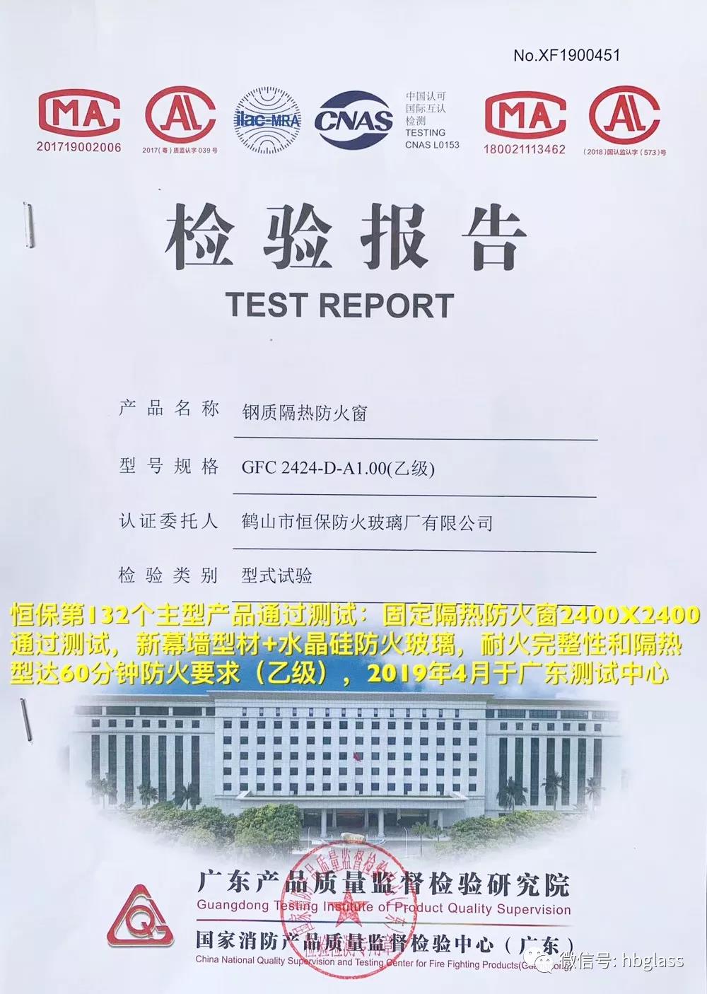 恒保第132個主型產品通過測試:2019年4月于廣東測試中心,恒保公司送檢的固定隔熱防火窗(2400X2400,新幕墻型材+福普思水晶硅防火玻璃),通過耐火完整性和隔熱型達60分鐘防火要求(乙級)測試要求,并獲得檢測合格報告。國家強制性CCC認證證書正在申請中。