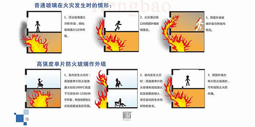 普通浮法玻璃遇火30秒炸裂,鋼化玻璃遇火1分鐘炸裂,不具備耐火完整性無法在一定時間內阻擋火勢蔓延。而單片防火玻璃,遇火時在1000℃高溫下可堅持30—120分鐘不炸裂,有效地限制火災以及煙霧波及的范圍。